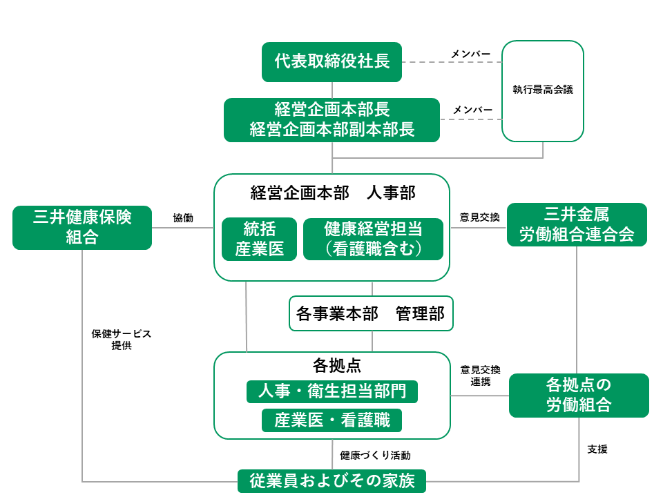代表取締役社長と担当役員をトップに据え、健康経営専任の担当部門が中心となり、三井健康保険組合、労働組合、各拠点の人事担当者・産業医・看護職等の関係者と健康経営を推進する体制を整えています。