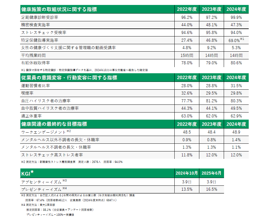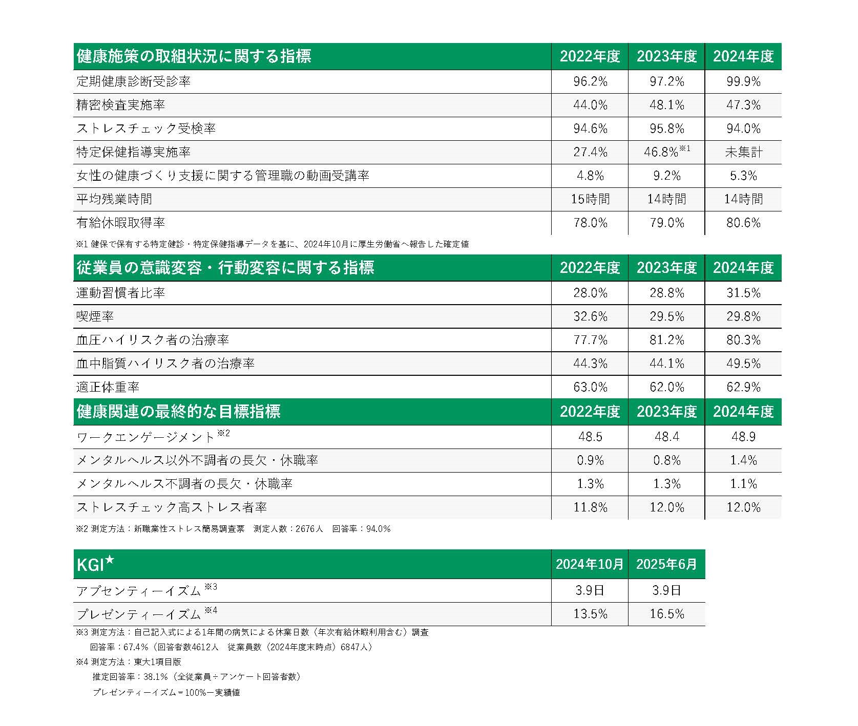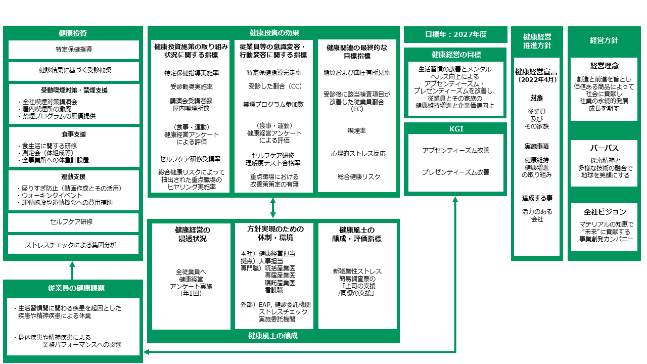 従業員とその家族が健康であることは、従業員の生活を充実させ、その個性・能力を最大限に発揮できる基盤となり、会社にとっても生産性を高め、業績向上に繋がってまいります。従業員およびその家族の健康維持・増進活動に取り組むことを通じて、さらに活力のある会社づくりを推し進め、以って社会に貢献し続けることを宣言します。