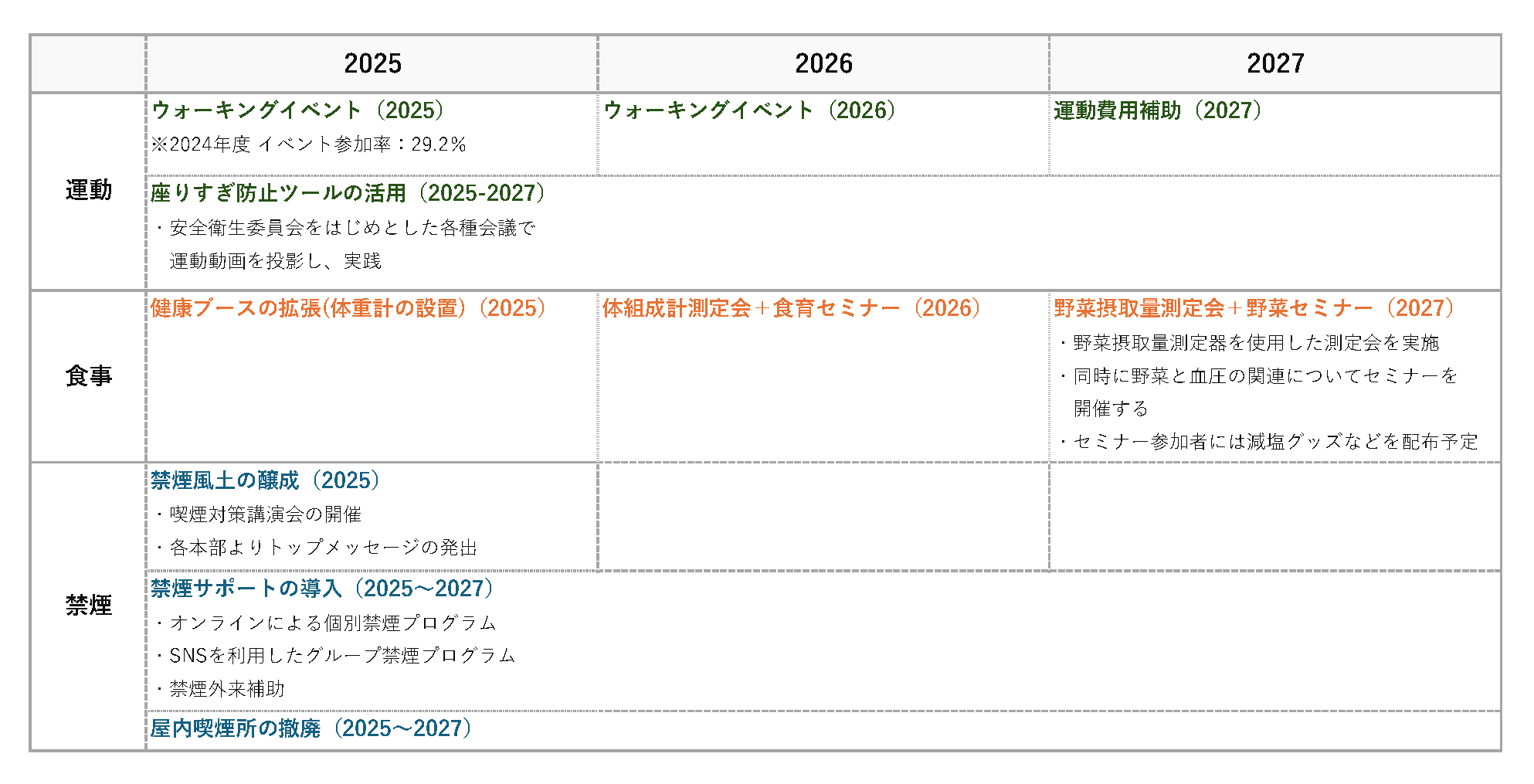 三井金属グループの健康課題を基に、各拠点の人事担当者・産業医・看護職をメンバーとした分科会にて、2025年から3年間かけて重点的に実施する健康施策を計画・実行しています。
