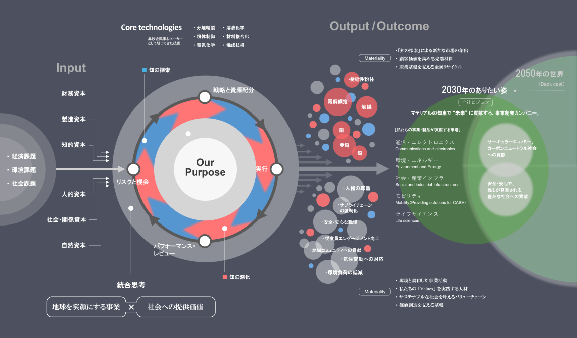 非鉄金属素材メーカーとして永年にわたり培ってきた技術と経験、築いてきたバリューチェーン。“マテリアルの知恵を活かす” こと、それこそが、私たちの 「価値」 を生み出す源です。そして、私たちのパーパスを基軸に、統合思考経営を実行し、全社ビジョンを達成していきます。 地球を笑顔にする領域で、「知の探索」 と 「知の深化」 のビジネスモデルを回し、長期的価値創造を実現します。