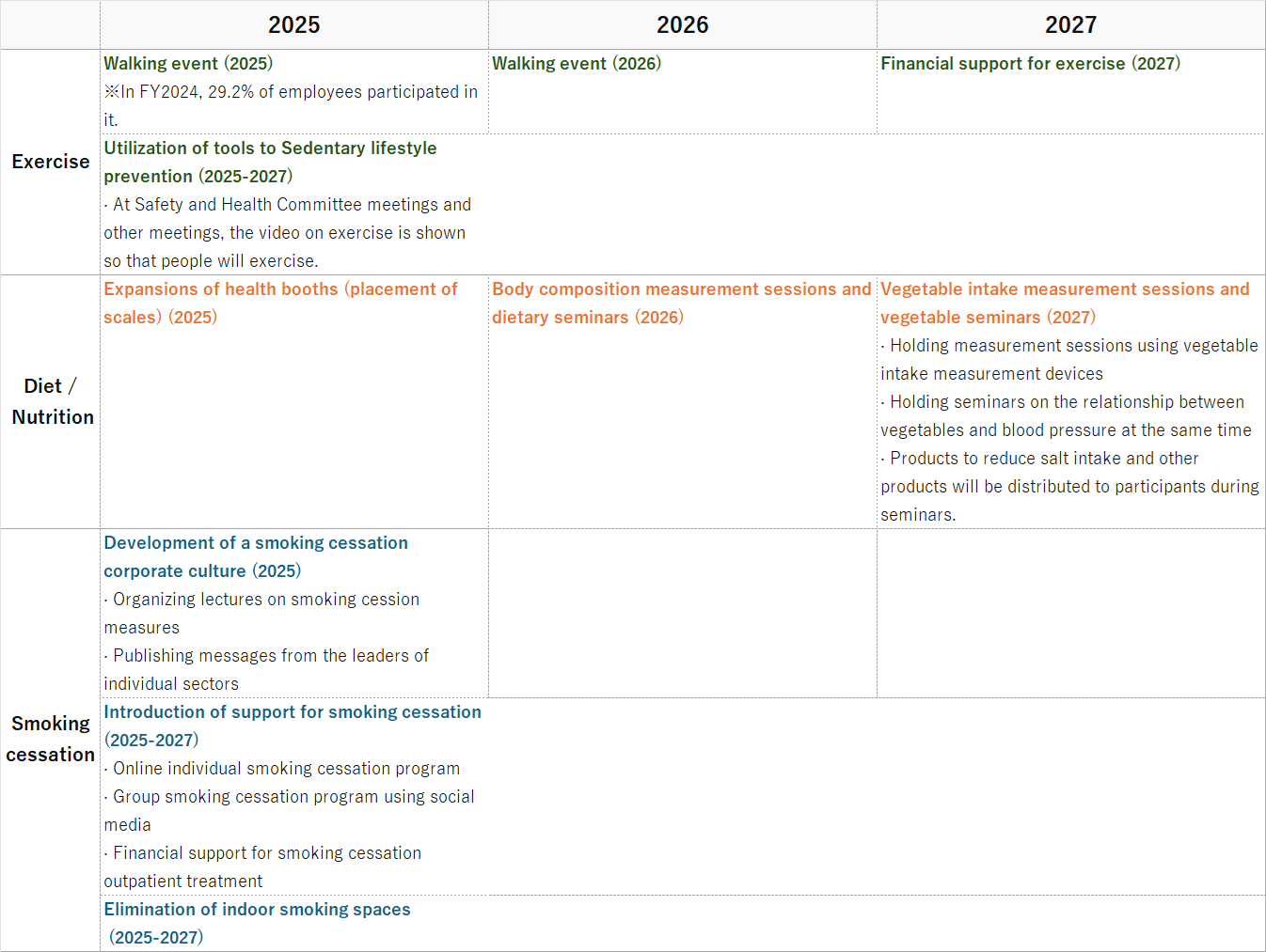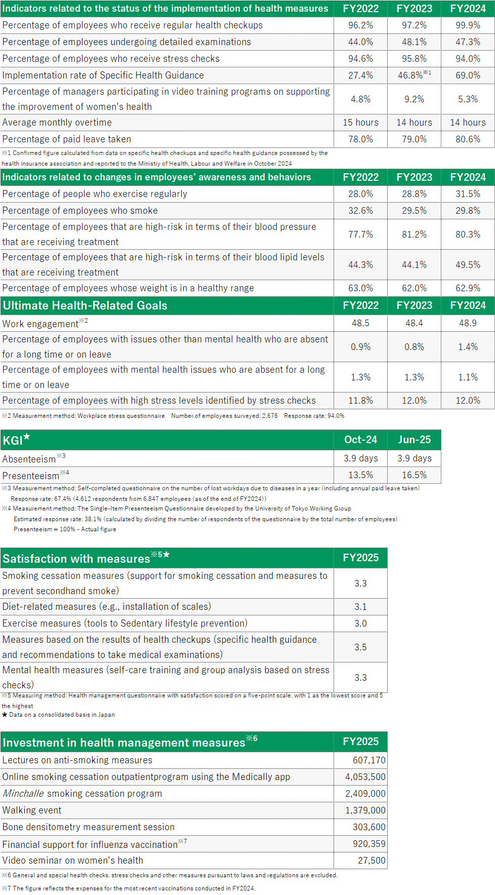 We assess the status of the implementation of individual health measures quantitatively and identify issues to improve our health improvement activities.