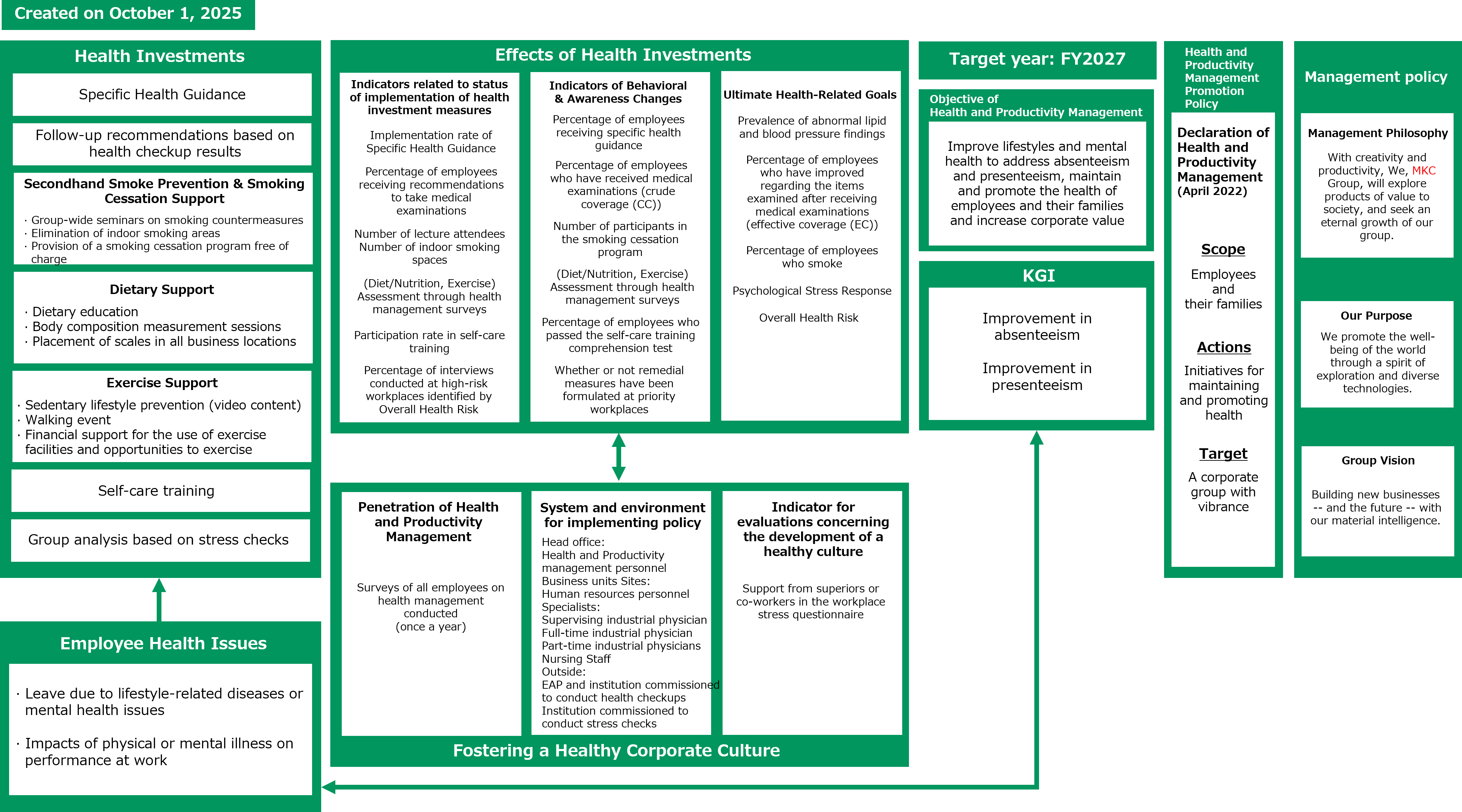 Our structure is led by the President and the officer in charge of Health and Productivity Management. The dedicated department collaborates with the Health Insurance Association, labor unions, and occupational health staff to promote these initiatives.