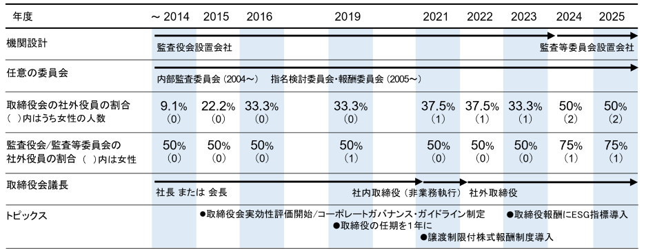 当社は、これまで業務執行取締役を中心に取締役会を運営してきましたが、経営に関する意思決定の迅速化を図ること、取締役会における審議事項を重点化して経営方針・経営戦略の策定などの議論をより充実させること、および取締役会の経営に対する監督機能の強化を図ることを目的として、2024年6月27日開催の第99期定時株主総会の決議により、監査等委員会設置会社に移行しています。同時に、取締役の半数を社外取締役とし、社外取締役には当社における社外役員の独立性基準に基づき独立性のある者を選任し、取締役会等で有益なアドバイスや意見を受けています。